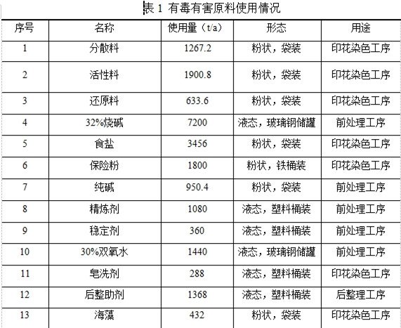 華紡股份有限公司現有項目使用的原料包括分散料、活性料、還原料、燒堿、保險粉、純堿、精煉劑、穩定劑等,其使用情況見表1。
