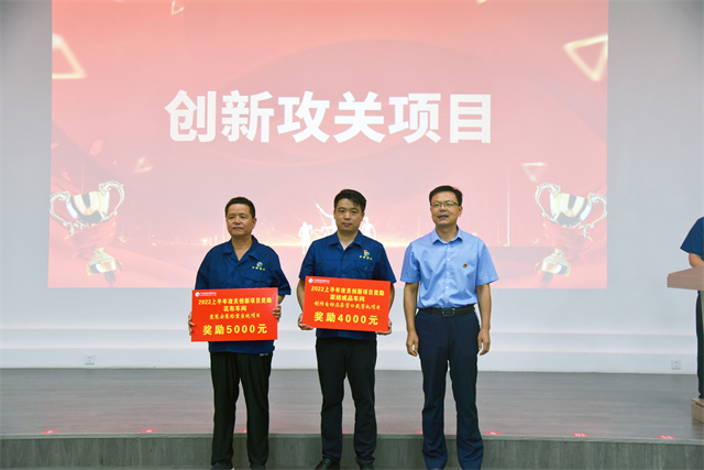 會上,李風明宣讀了公司對2022年上半年度CQI項目、創新攻關成果等表彰決定;盛守祥為CQI項目代表、創新攻關一等獎項目代表頒發獎勵牌,總經理閆英山為各車間創新攻關其他受獎項目代表頒發獎勵牌,李風明為質量之星、效率之星、工藝操作之星受獎代表頒發榮譽證書,公司安全總監孫中然為現場6S之星、精益提案之星受獎代表頒發榮譽證書。會議由公司團委書記陳冰主持。