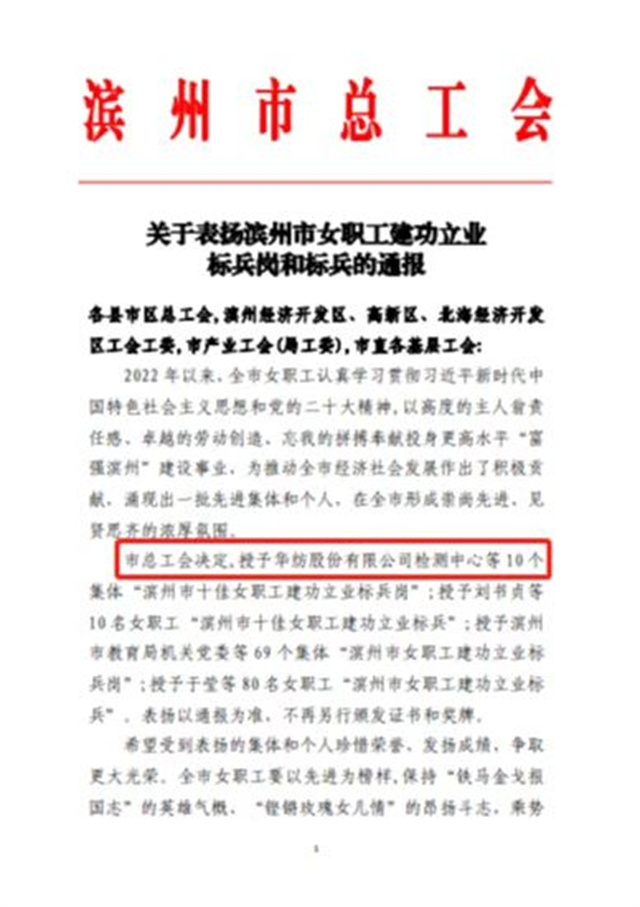 日前,濱州市總工會發布了《關于表揚濱州市女職工建功立業標兵崗和標兵的通報》,華紡股份有限公司檢測中心榮獲“濱州市十佳女職工建功立業標兵崗”榮譽稱號。