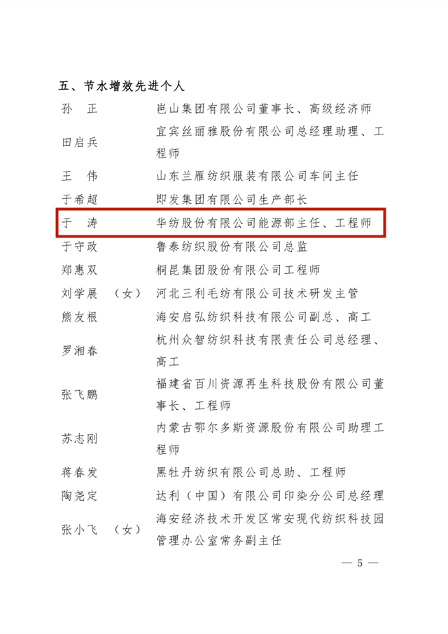 導讀:公司在全國紡織行業綠色發展勞動競賽中獲評“節水標桿企業”榮譽稱號、公司系統工程部能源副總工于濤榮獲“節水增效先進個人”榮譽稱號。