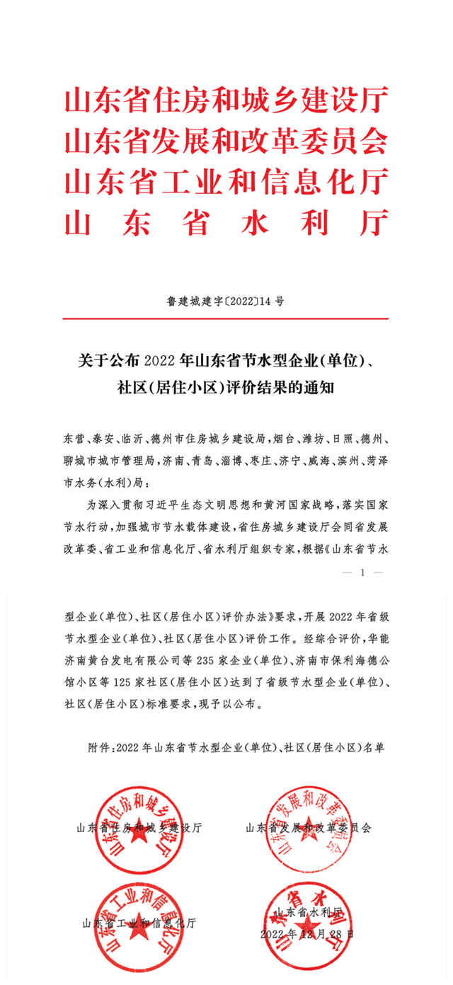 近日,山東省住房和城鄉建設廳會同山東省發展和改革委員會、山東省工業和信息化廳、山東省水利廳發布了《關于公布2022年山東省節水型企業(單位)、社區(居住小區)評價結果的通知。經綜合評價,公司達到了省級節水型企業的標準要求,獲評山東省節水型企業。