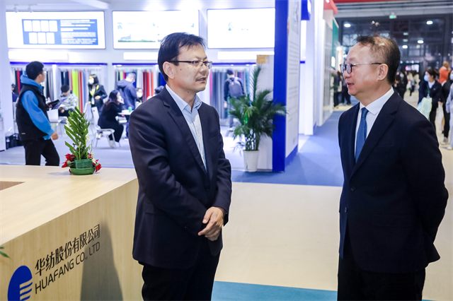 期間,中國紡織工業聯合會會長孫瑞哲,國家紡織產品開發中心主任李斌紅,國家紡織產品開發基地秘書處秘書長、中國紡織信息中心產品開發部主任陳小麗等到公司展位觀展。在與公司黨委書記、董事長盛守祥及服裝面料分公司總經理王超交流中,孫瑞哲提到,華紡作為中國紡織印染行業的龍頭骨干企業,要加強與參展企業交流溝通,既要展現公司魅力,又要做好信息交換、交流學習等相關工作,抓住機會,拓展品牌影響力,為公司開拓市場、擴大知名度,實現從制造加工向品牌創意的轉型升級夯實基礎。