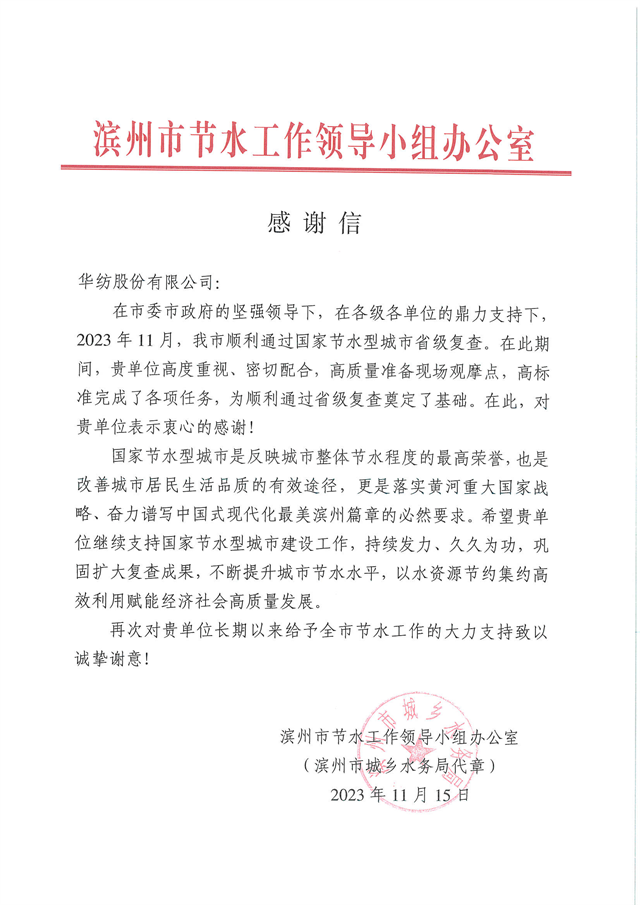 近日,濱州市節水工作領導小組辦公室向公司發來一封感謝信,信中指出:“2023 年11月,我市順利通過國家節水型城市省級復查。在此期間,貴單位高度重視、密切配合,高質量準備現場觀摩點,高標準完成了各項任務,為順利通過省級復查奠定了基礎。”