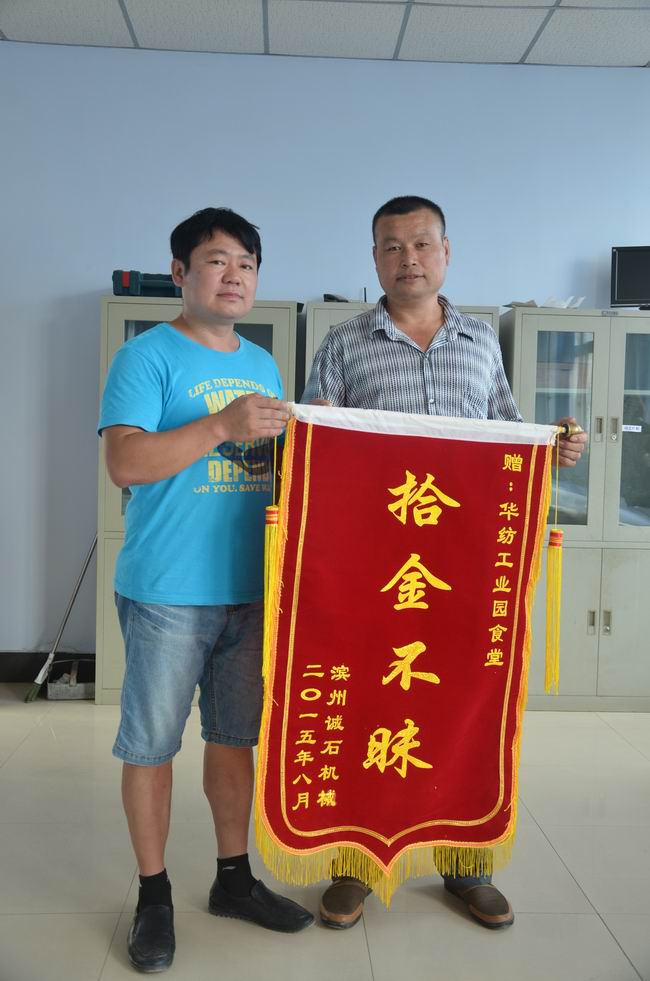 導讀:前不久,在公司科技產業園區食堂工作的陳春青收到了濱州誠石機械工作人員送來的錦旗,在對其拾金不昧表示感謝的同時,也表達了對陳春青的敬意。 就在不久前,濱州誠石機械的工