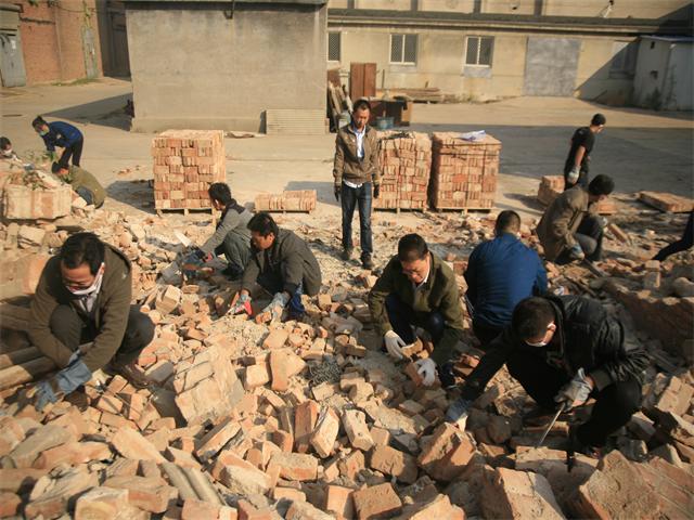 導讀:從10月10日開始,各主體車間及職能部室的部分員工下了班兒,相互約著來到現公司所屬的原經編廠廠區,對部分拆除后的房屋出現的紅磚進行整理,以便再利用。