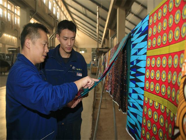 11月23日,在公司花二車間的生產現場,工程師田道國(左)與印制乙班班長寧方乾(右)來到“疵布展示區”,就最近兩天印花產品的質量情況進行交流與討論。