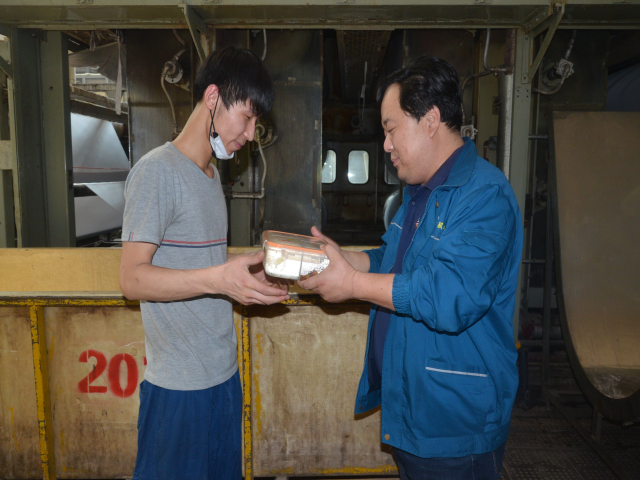 “紅燒肉、炸魚、雞腿、花卷、酸辣土豆絲”,這是公司為3月份過生日的50名單身員工準備的單身員工生日餐。中午下班后,“壽星”們陸續來到餐廳領取屬于自己的生日餐,研究院李佳奇打開生日餐盒,直言道“好香啊”。對于生產崗位三班員工,車間將統一領取,送到“壽星”所在的崗位。這不,今天中午家紡車間主任王旭洲早早地領到孔慶凡和王亞開兩位員工的生日餐,并送到了他們的手中。